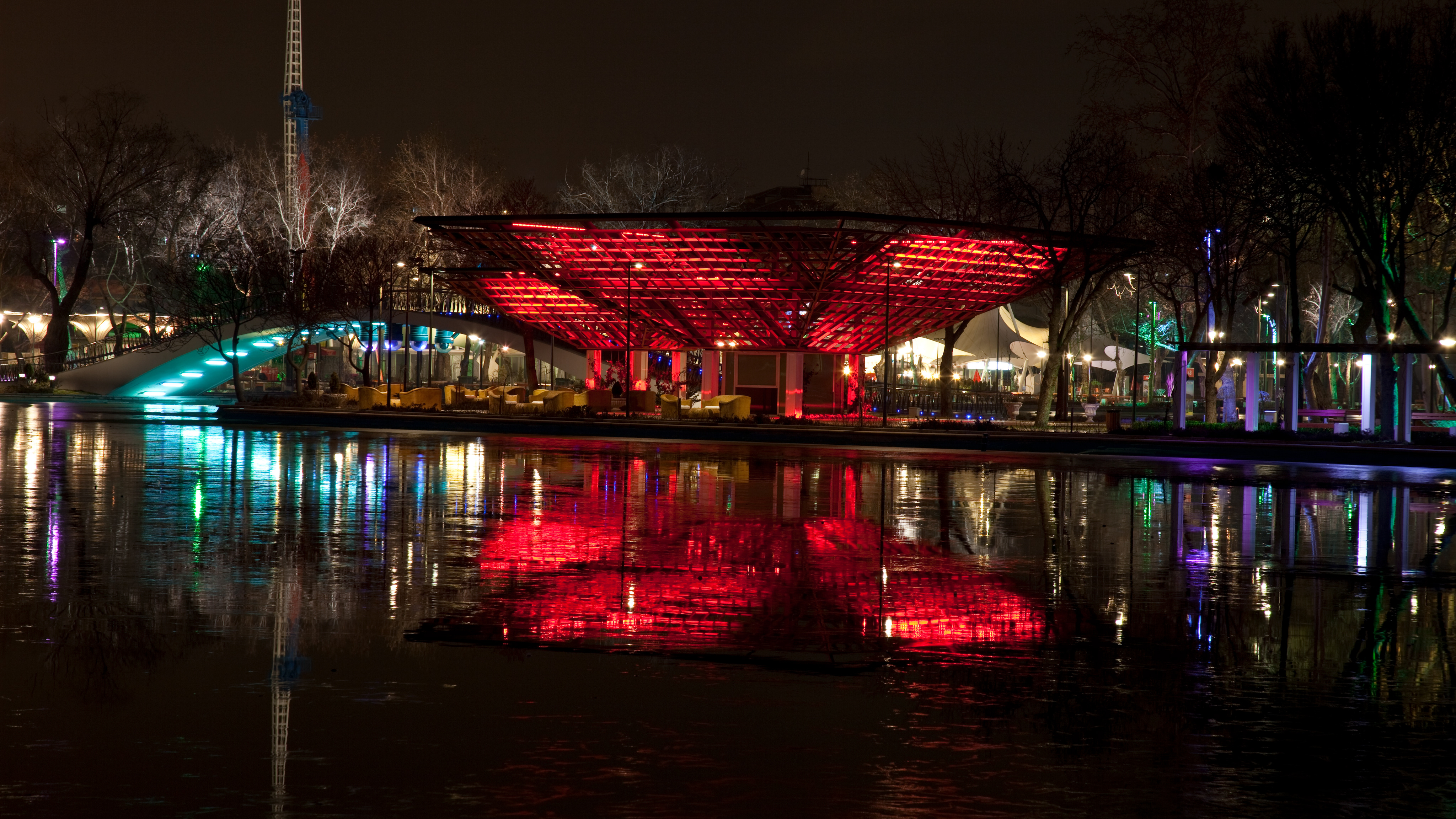 The Main bridge connecting the park with the amusement park. The lighting fixtures attached to the surface are reflected in the water, producing a mirror image that gives the impression of a closed loop.
